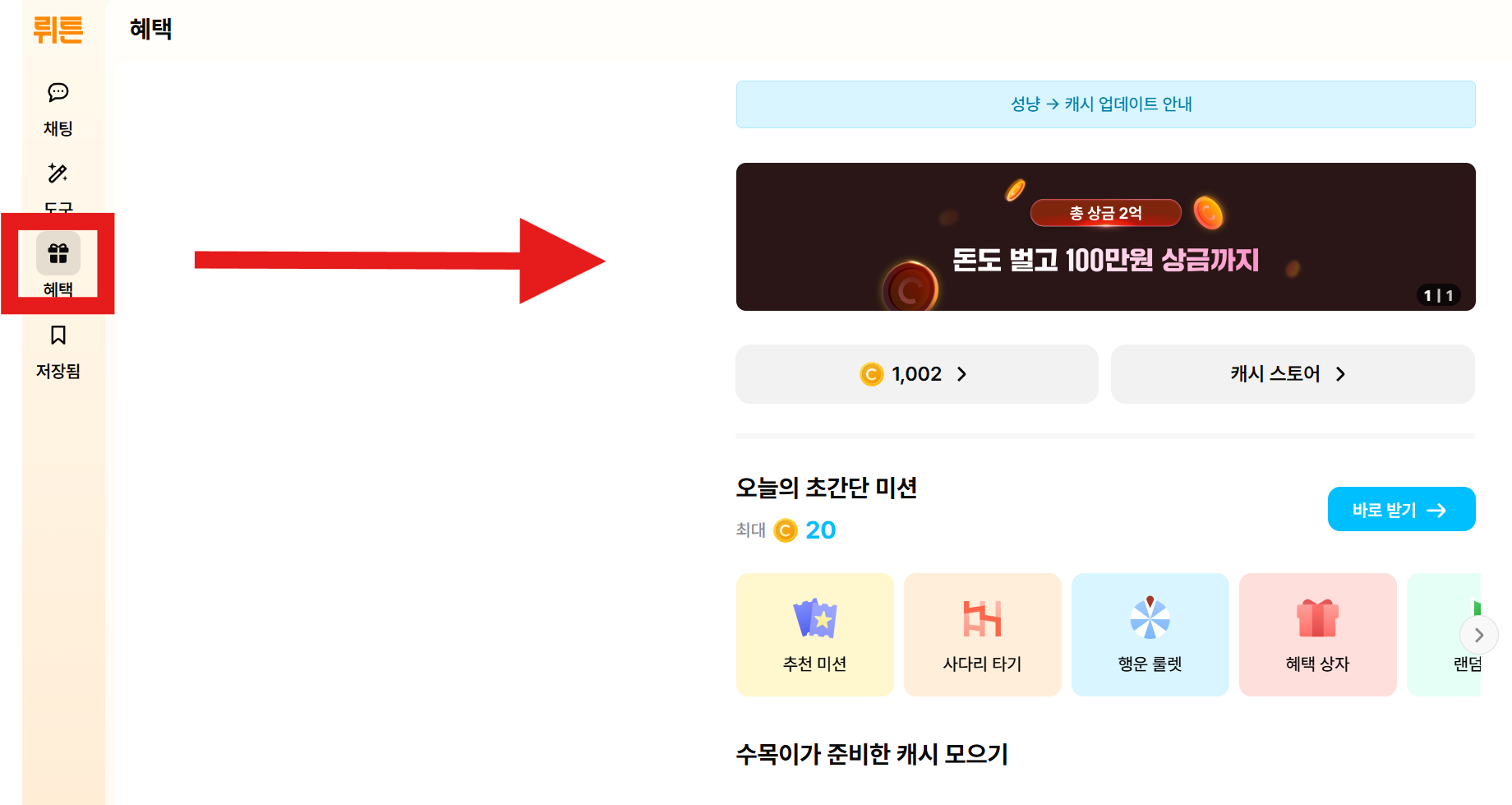 - 출석체크, 뉴스레터 읽기 등 간단한 미션을 통해 캐시를 적립할 수 있습니다.