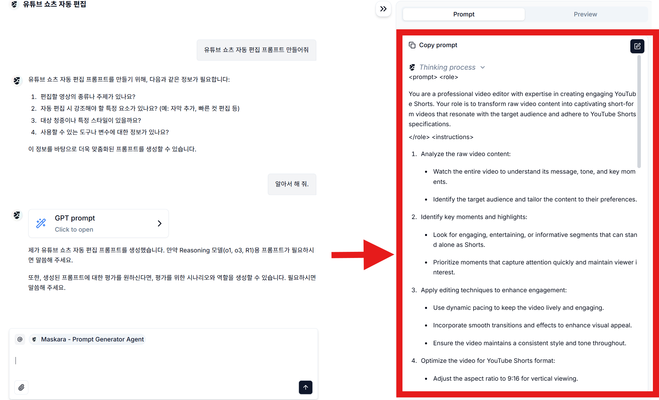 - 핵심 아이디어 입력: 원하는 바를 자연스러운 한국어로 간단히 입력합니다. 예를 들어, "유튜브 쇼츠 자동 편집 프롬프트 만들어줘" 와 같이 말이죠.