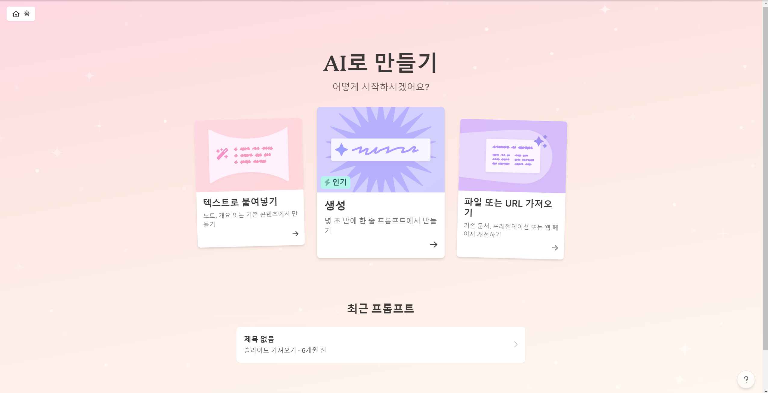 AI가 만들어주는 프레젠테이션이 내 마음에 쏙 들지 않아도, 처음부터 끝까지 내가 만드는 것보다는 어느정도 내용이 있는 것에서 만드는 것이 훨씬 쉽잖아요. ^^