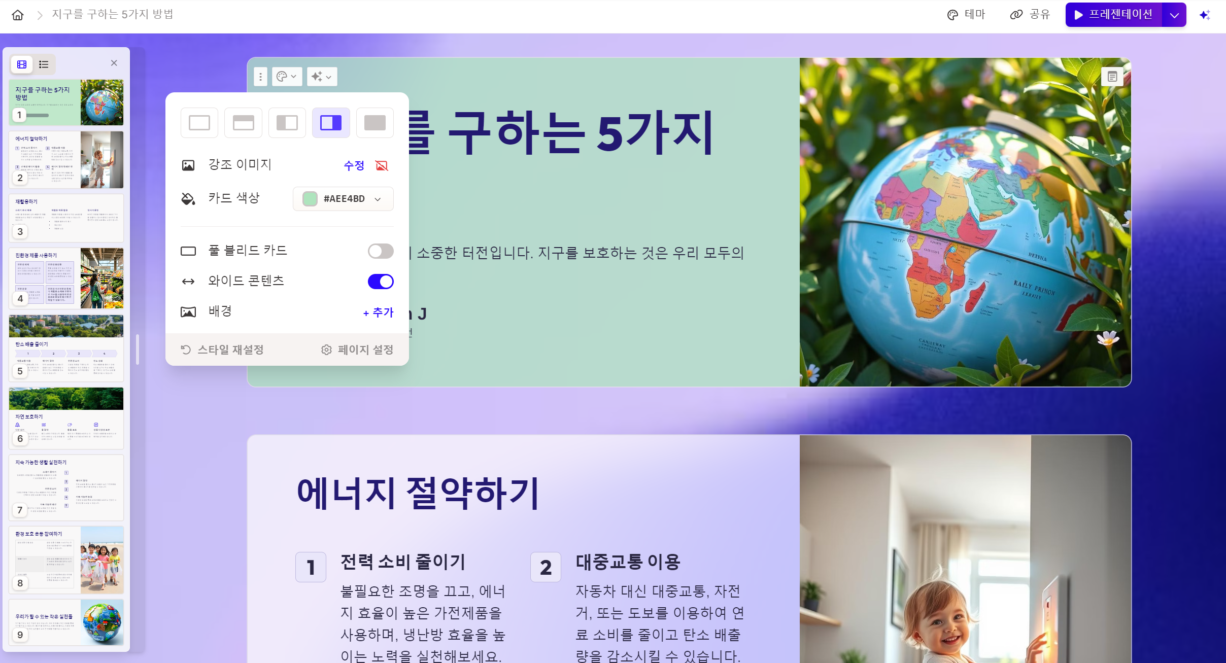 - 팀원들과 함께 프레젠테이션을 만들고 싶다면, 공유 링크를 통해 팀원들에게 초대 링크를 보내면 됩니다. 이 예시에서는 협업할 수 있도록 "지구를 구하는 5가지 방법" 프로젝트를 공유하고, 실시간으로 팀원들과 수정 작업을 할 수 있습니다.