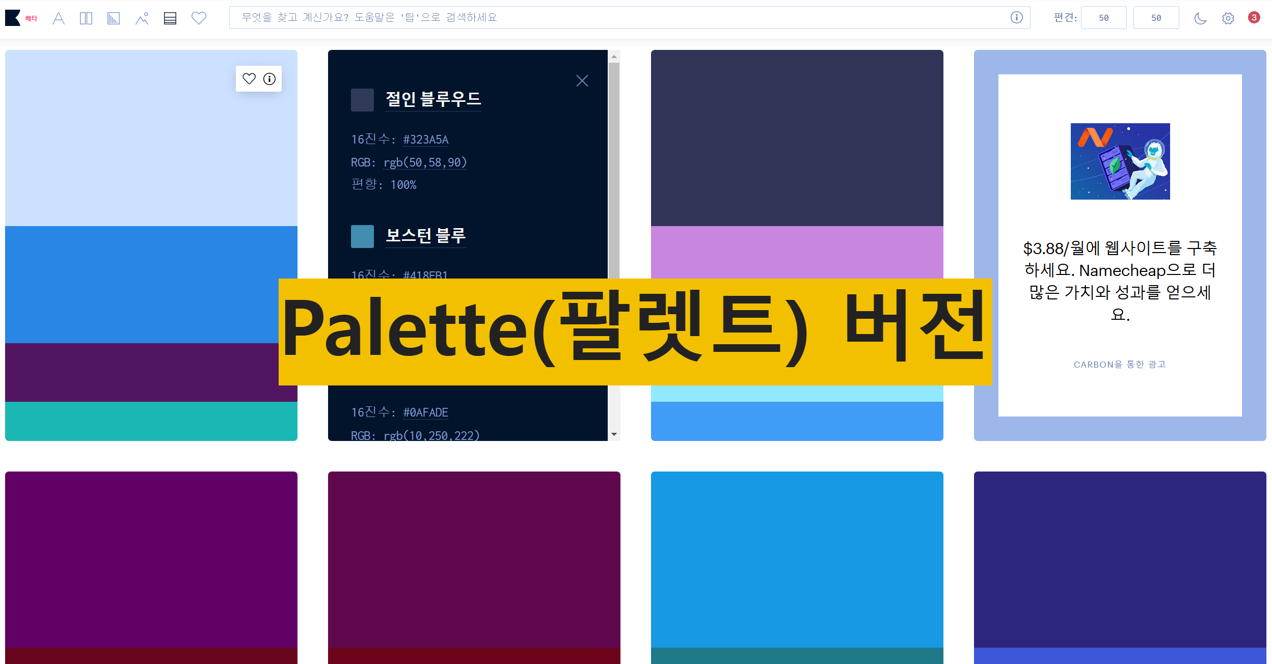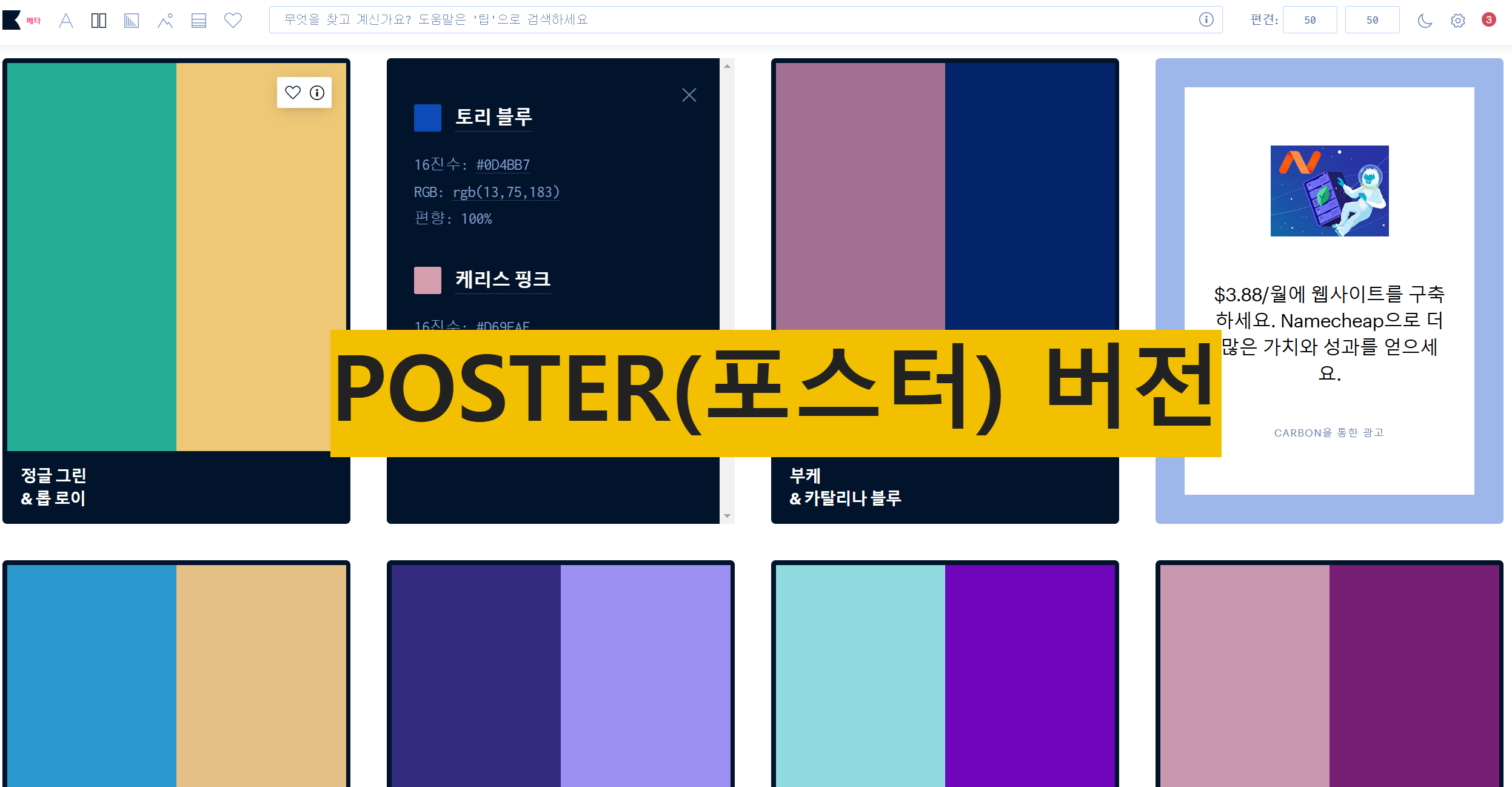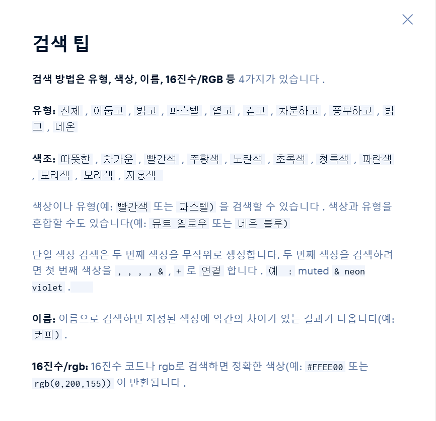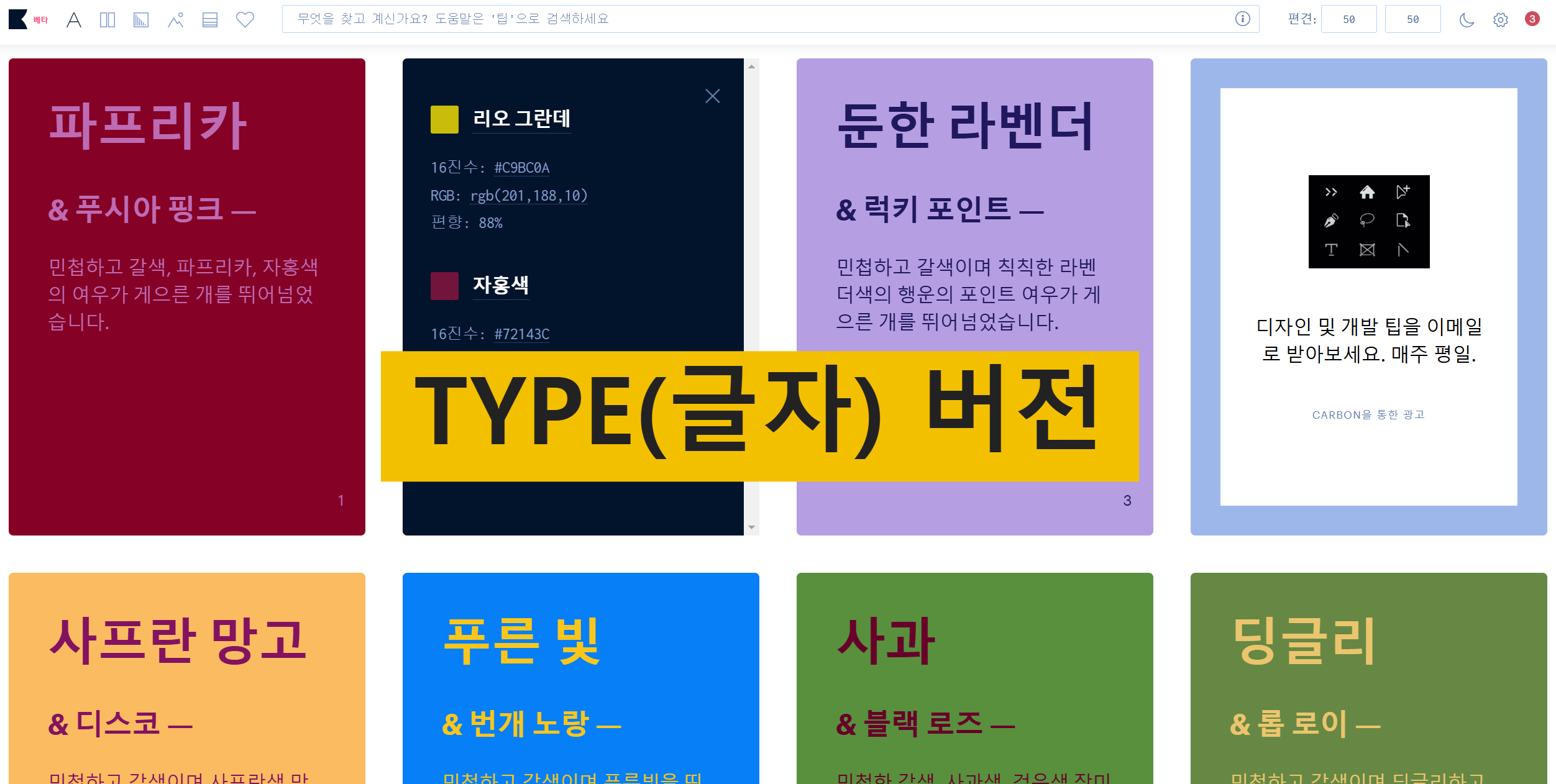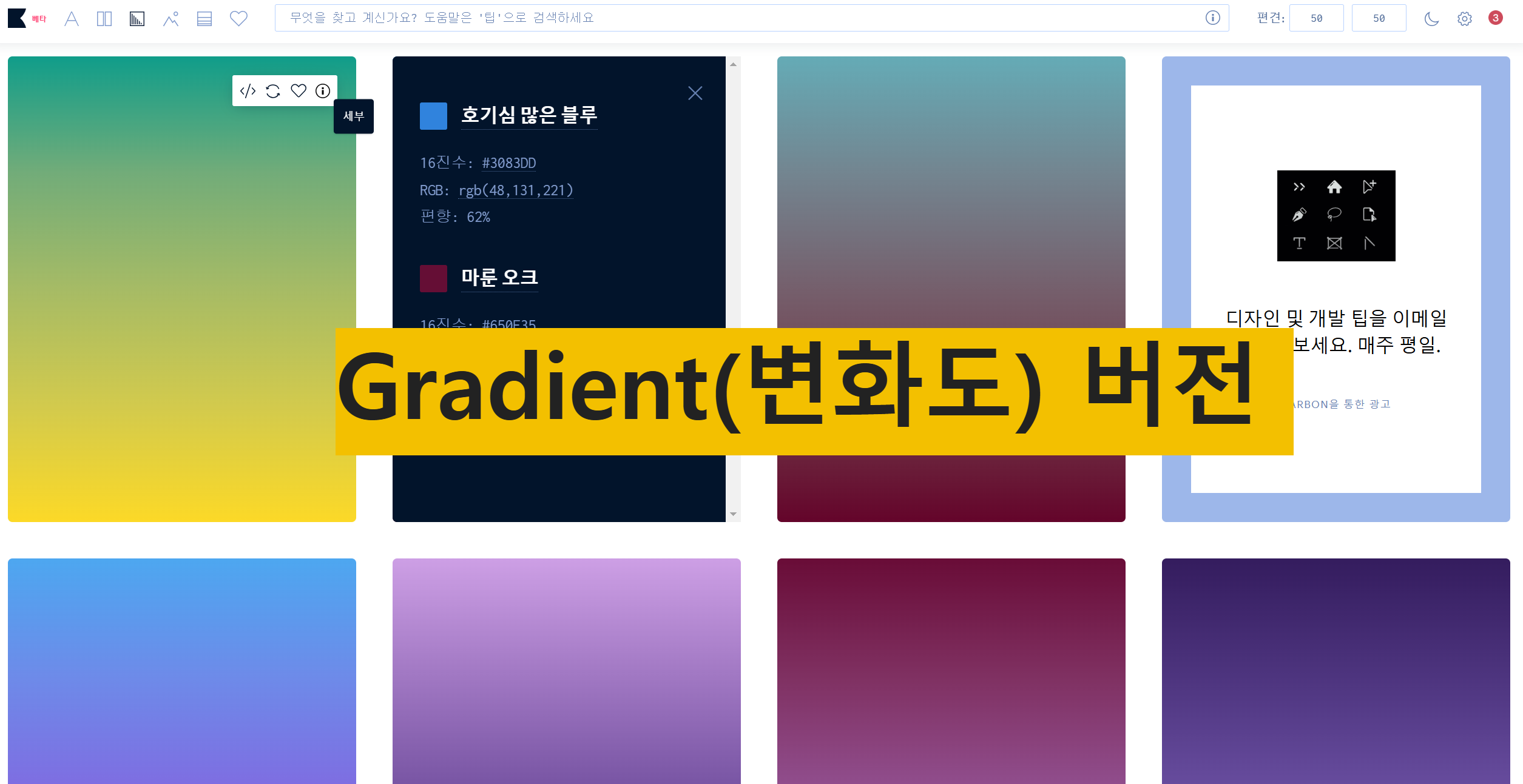 추천된 컬러 팔레트는 배경, 텍스트, 그라디언트 등 다양한 형태로 미리 보기가 가능합니다. 원하는 색상 조합을 저장하고, HEX 또는 RGB 코드로 내보내어 다른 디자인 프로그램에서도 활용할 수 있습니다. (색카드 위에 마우스를 보이는 i를 클릭하면 색상 이름, 코드가 바로 나옵니다.)