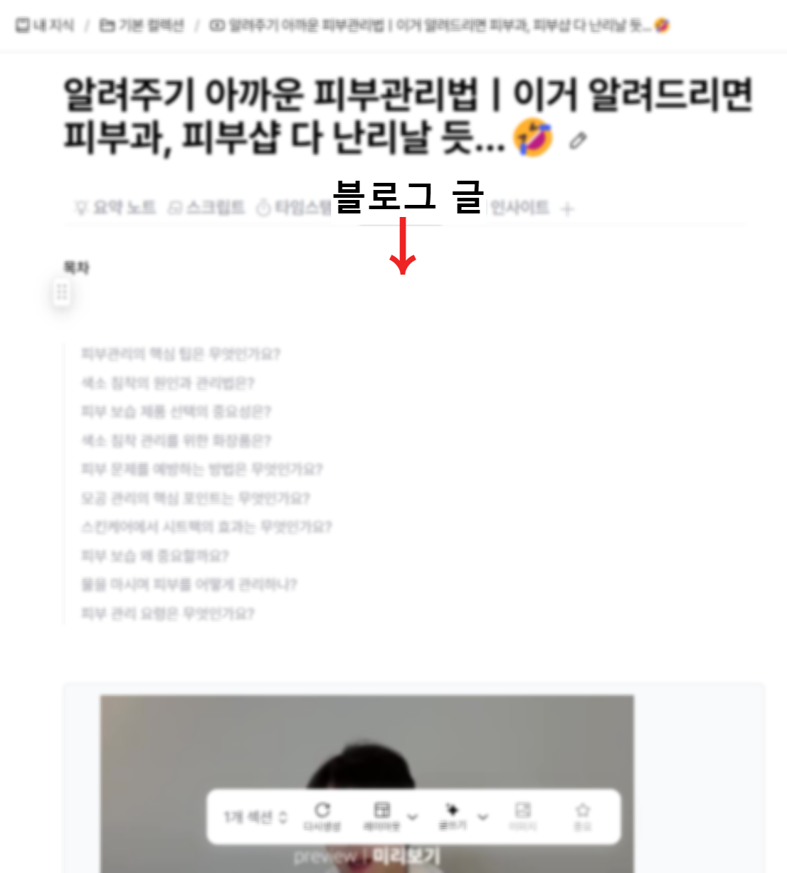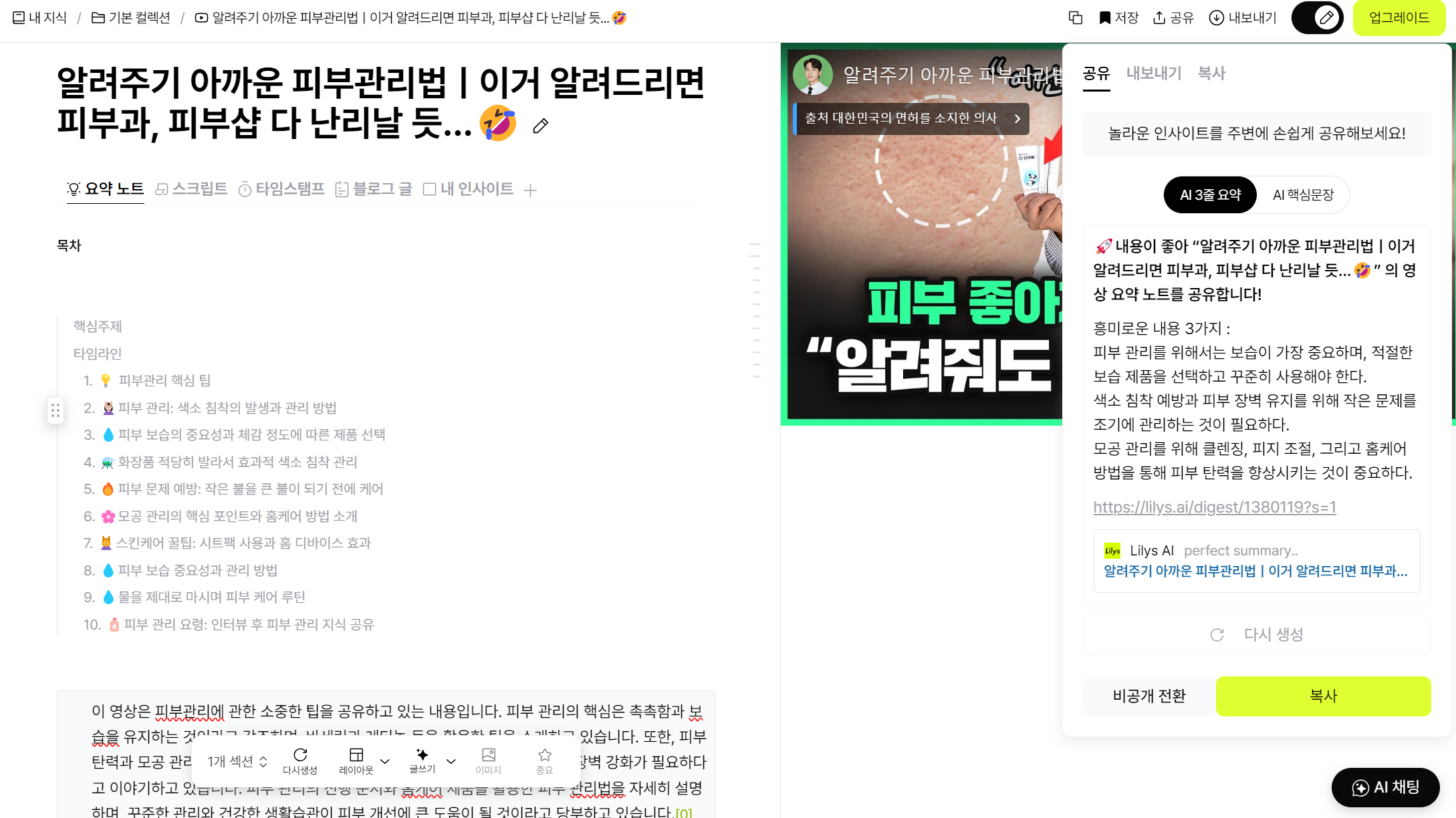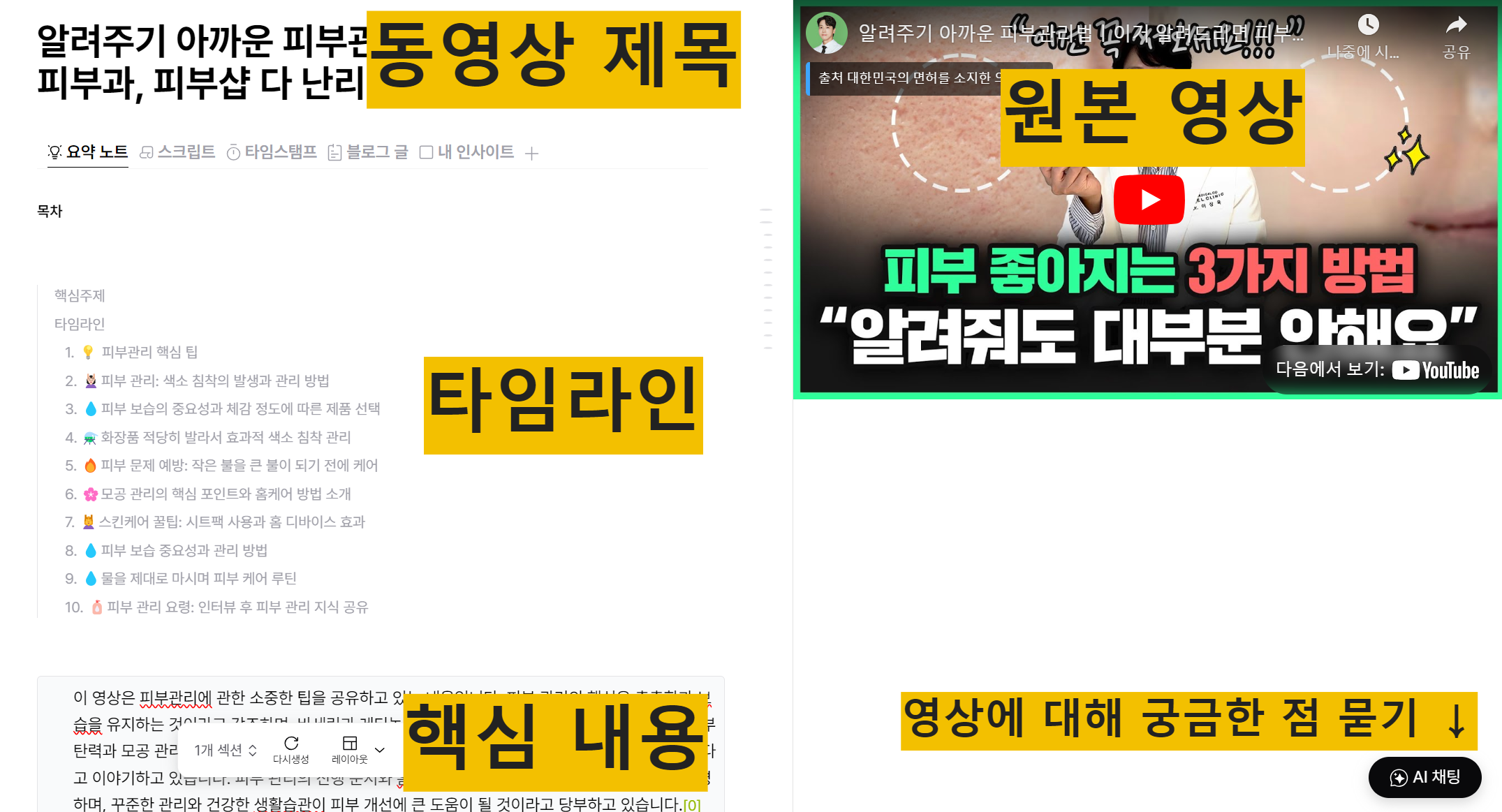 그 결과 제목과 요약노트, 원본 영상, 영상의 핵심 내용이 차례로 뜨는 것을 볼 수 있습니다.