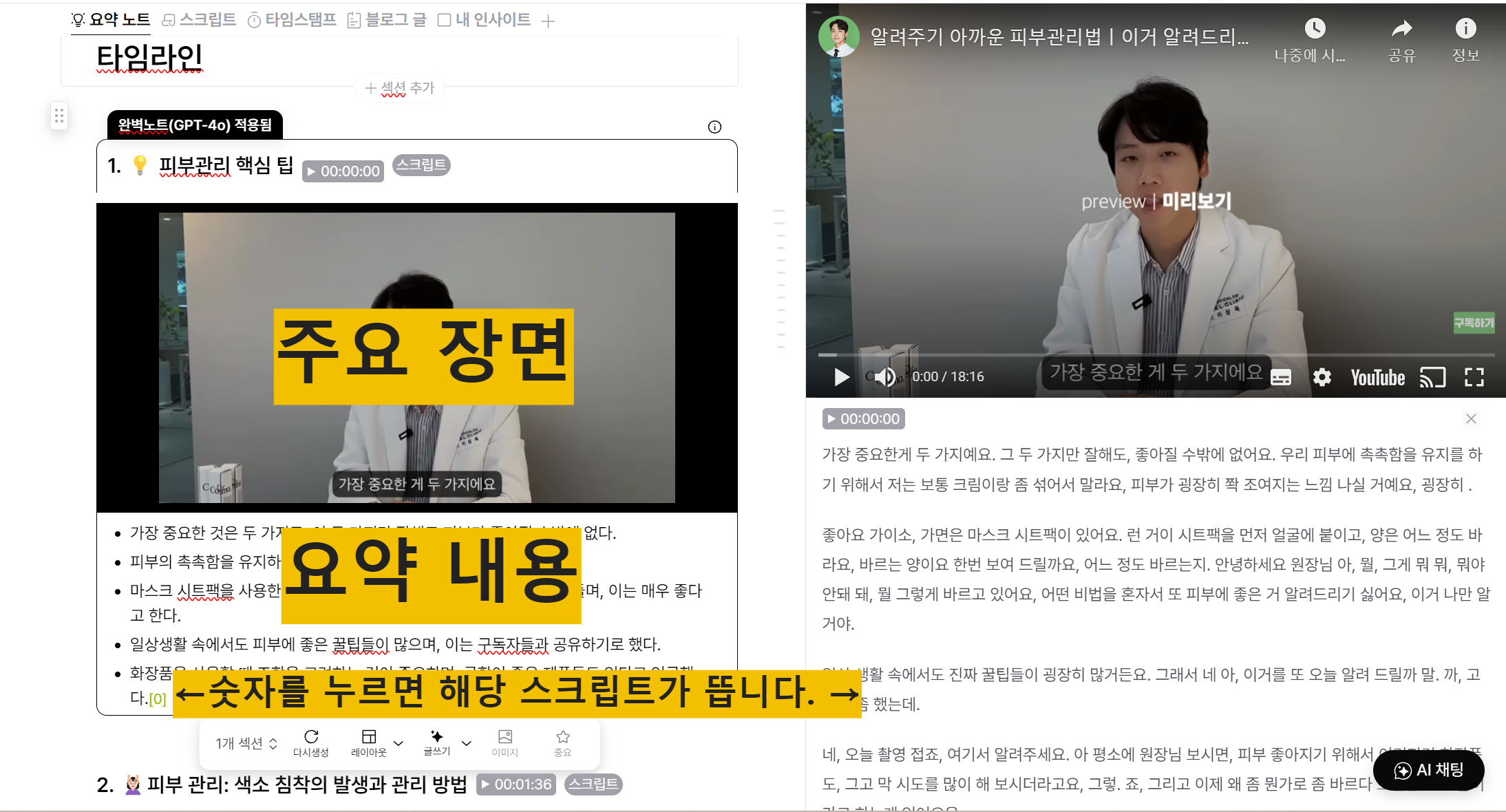 기본 버전인 요약노트에 타임라인을 누르면 주요 장면과 함께 요약 내용이 함께 나옵니다. 그리고 장면마다 숫자가 매겨지는데, 작은 숫자를 누르면 해당 장면과 그 스크립트 전체 문장이 뜹니다. 정말 편리하죠?