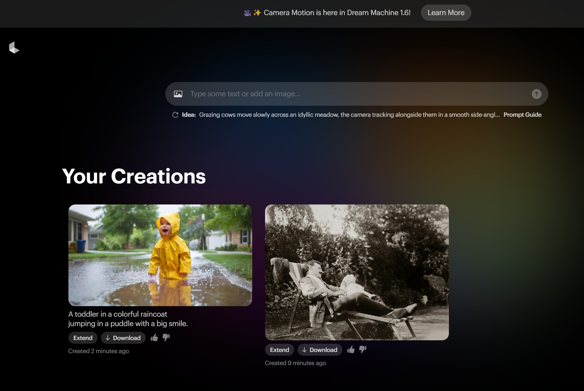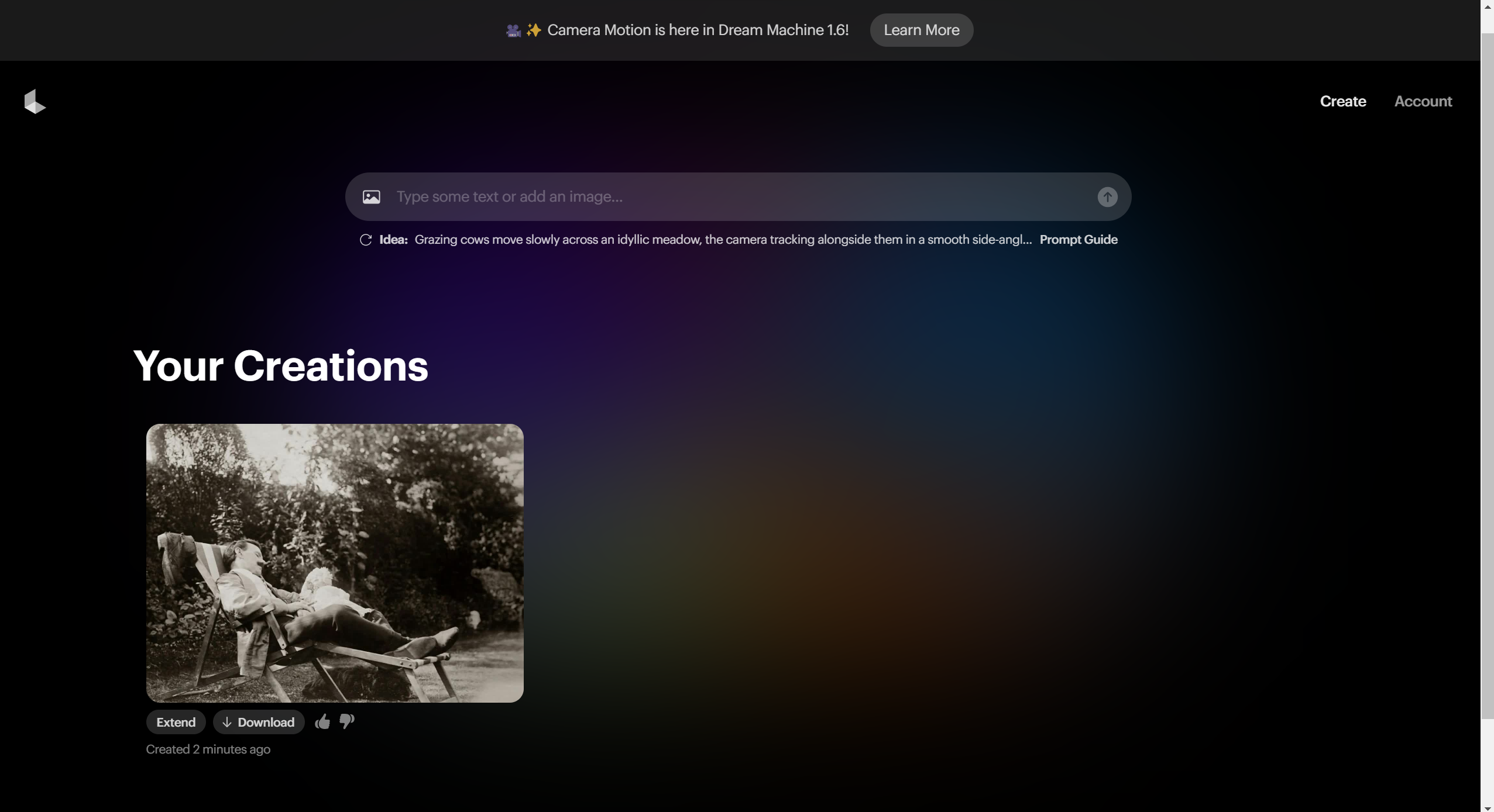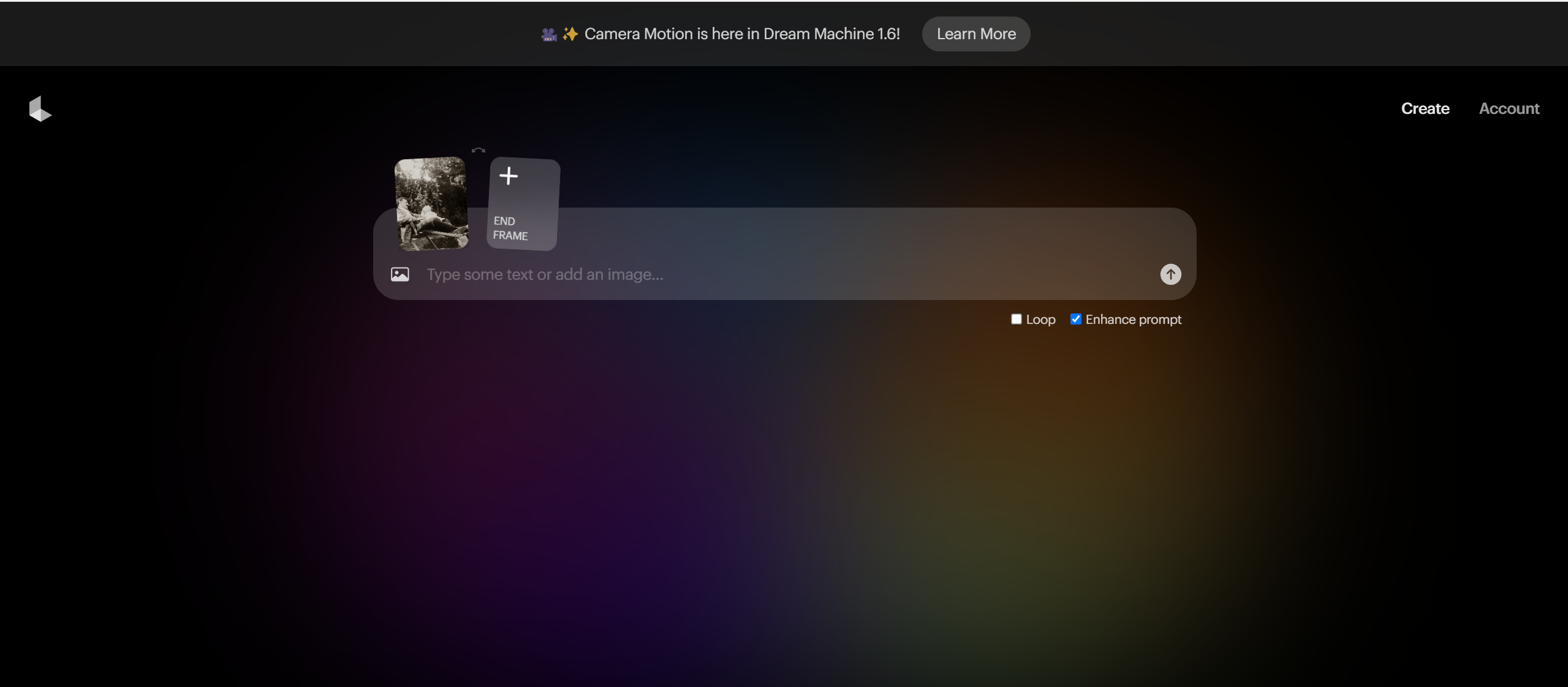 - 사이트 접속 및 로그인 먼저, Dream Machine에 접속해 로그인하세요. 간단한 이메일 등록만으로 쉽게 시작할 수 있습니다. 로그인 후, 메인 화면에서 AI로 이미지를 생성할 수 있는 창이 뜨는데요, 이곳에서 다양한 프롬프트를 통해 원하는 이미지를 만들 수 있어요.