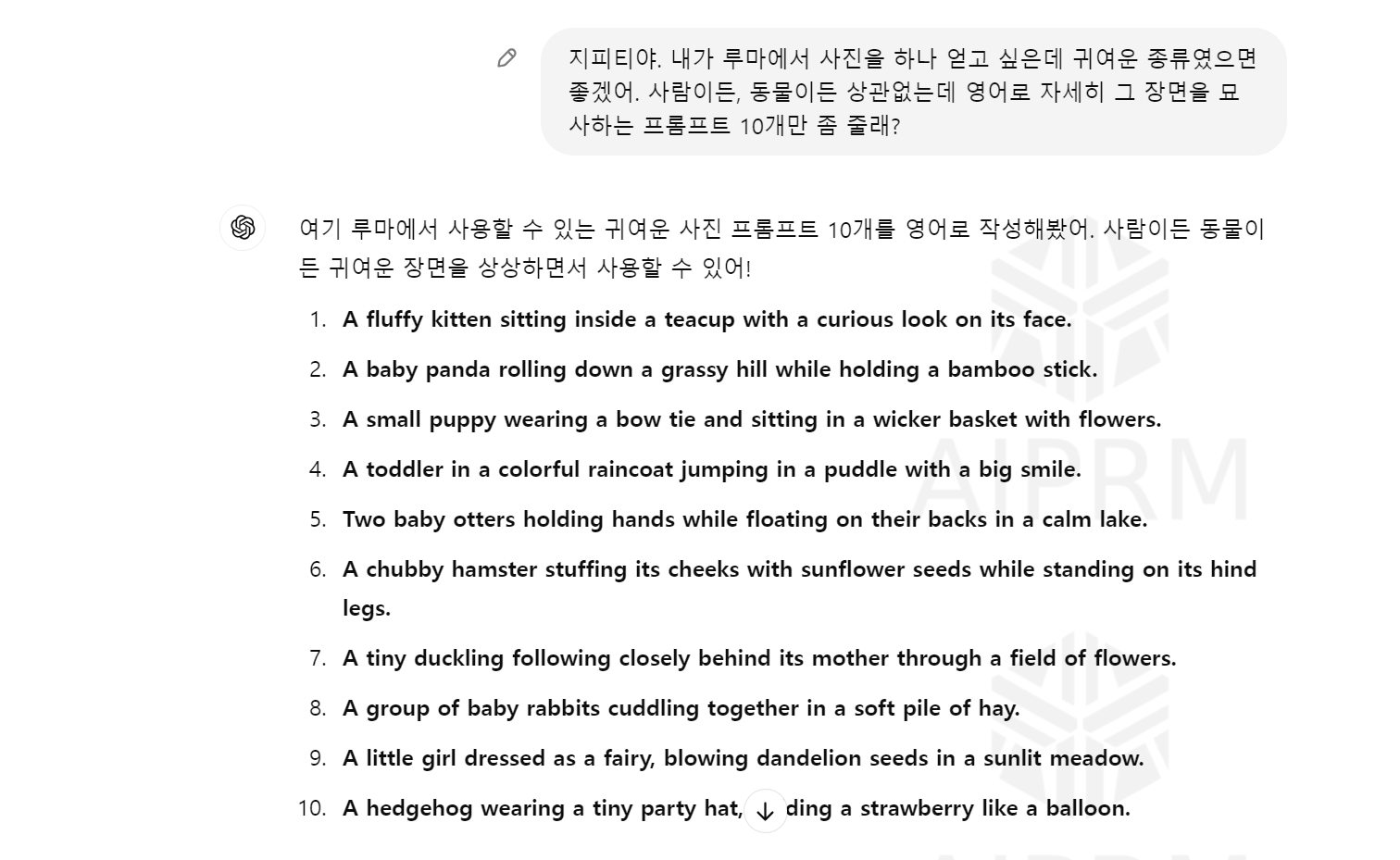 그 중에 마음에 드는 프롬프트를 가져와 루마 창에 칩니다. 저는 귀여운 아이 4번을 선택해 볼게요.