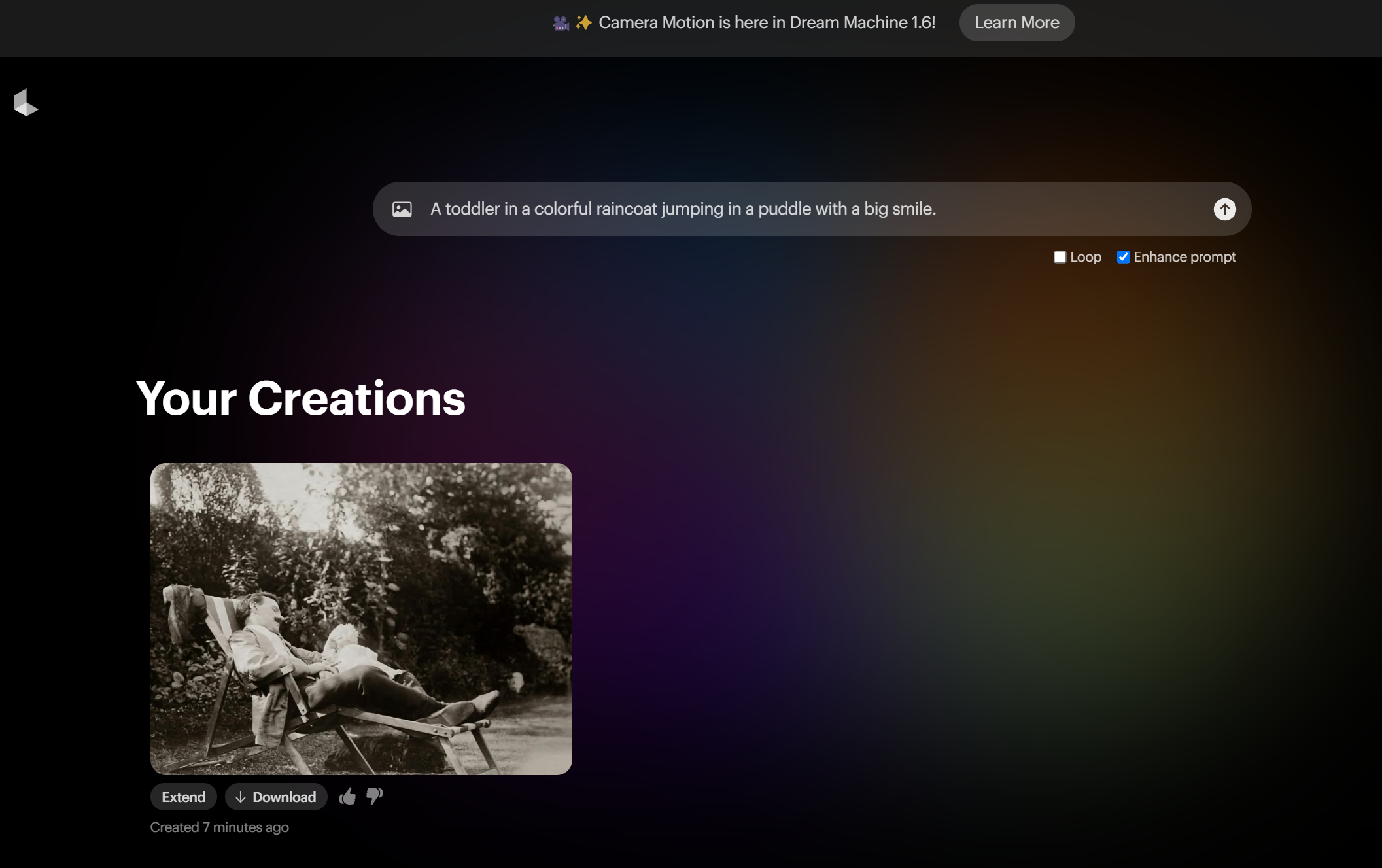 결과물 밑에 Extand를 누르면 이 결과물로 또 다른 영상도 만들 수 있습니다. 프롬프트를 어떻게 넣느냐에 따라서요^^